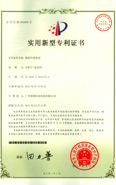 2011年1月12日广州美络信息科技有限公司取得了数据管理装置《实用新型专利证书》。