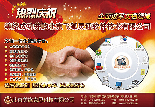 热烈庆祝美络公司成功并购北京飞狐灵通软件技术有限公司,这一举措预示着我公司将全面进军文档一体化和档案数字化等领域,在未来的发展中我公司会有更大举措,力争开拓出更广阔的新天地,为用户提供更多更好的产品、技术和服务。