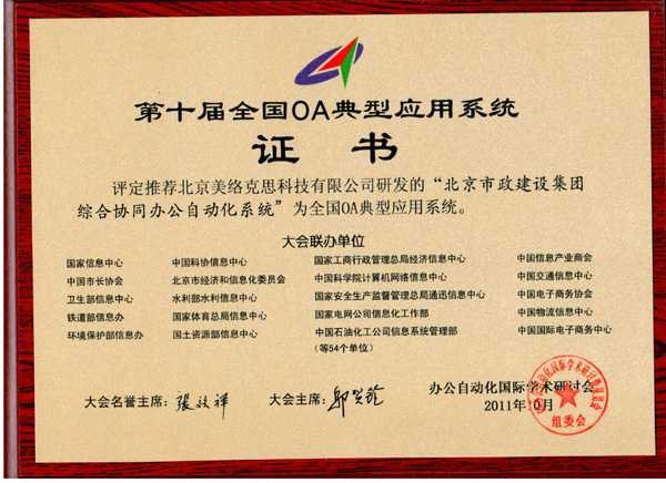 金秋十月,是一个收获的季节,由北京美络克思科技有限公司为中国铁建十六局集团研发的“中国铁建十六局集团有限公司文档一体化综合协同平台”及为北京市政建设集团公司研发的“北京市政建设集团综合协同办公自动化系统”荣获第十届全国OA典型应用系统,北京美络克思科技有限公司也获得了典型应用系统研发单位的称号。