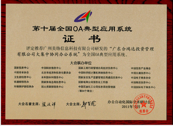同时,由广州美络信息科技有限公司为广东合鸿达投资管理有限公司研发的“广东合鸿达投资管理有限公司大集中协同办公系统”也荣获第十届全国OA典型应用系统,广州美络信息科技有限公司获得典型应用系统研发单位称号。