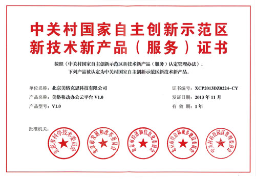 根据《中关村国家自主创新示范区新技术新产品(服务)认定管理办法》的规定,经专家评审,市科委、市发展改革委、市经济信息化委、市住房城乡建设委、中关村管委会拟认定,北京美络克思科技有限公司产品“美络移动办公云平台V1.0”成功获得“中关村国家自主创新示范区新技术新产品资质认定。