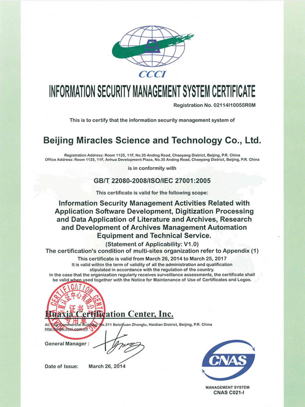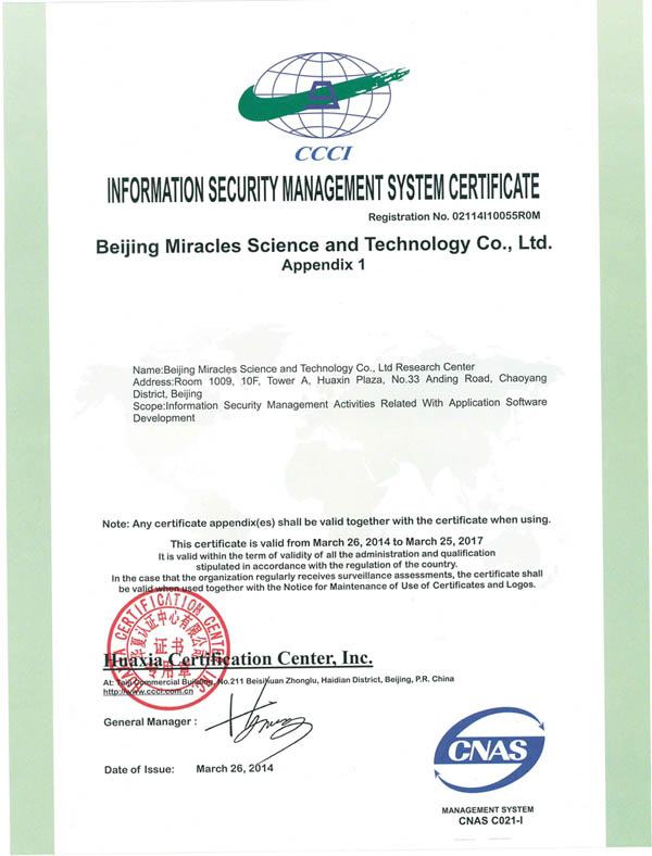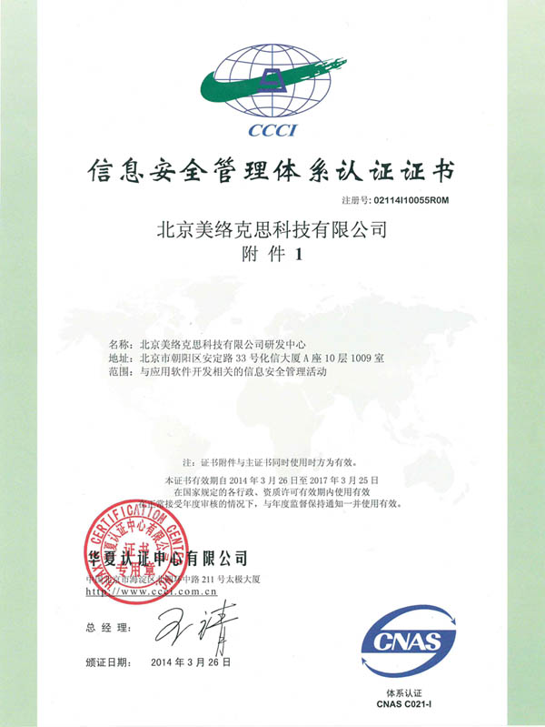 根据《信息安全管理体系认证管理办法》的规定,经中国信息安全认证中心专家评审,北京美络克思科技有限公司成功取得“信息安全管理体系认证”。通过我公司成功获得”信息安全管理体系认证,标志着我公司在信息安全管理体系的工作上又迈上了一个新的高度。