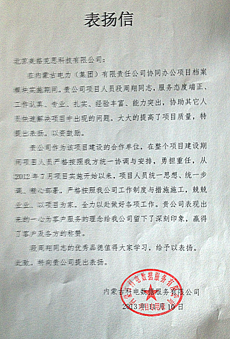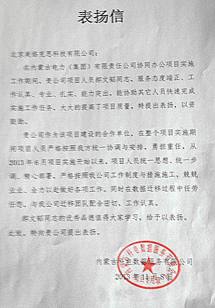 我公司外派到内蒙古科电数据公司员工段周翔、郝文韬,在参加内蒙古电力(集团)有限责任公司协同办公系统项目实施过程中,服务态度端正、工作认真、专业、扎实、经验丰富、能力突出,全力以赴做好各项工作,赢得了客户及各方的称赞,希望公司全体员工向段周翔、郝文韬同志学习,刻苦专研技术努力提高自己的专业水平,提高服务质量,兢兢业业以项目为家,全力以赴为客户提供更好的服务。